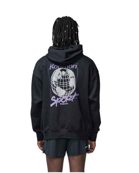 • This black hoodie features a minimal Koumori graphic on the front and a large Koumori Sport globe graphic on the back in lilac and grey tones. Made from cotton with a regular fit, it includes a pocket in the front and adjustable hood for added functionality.
