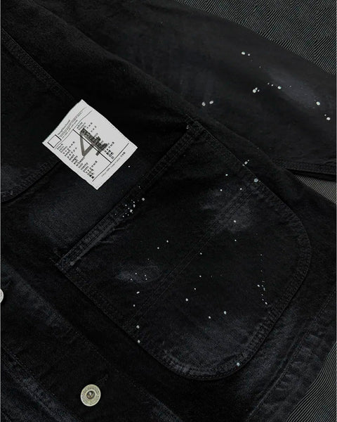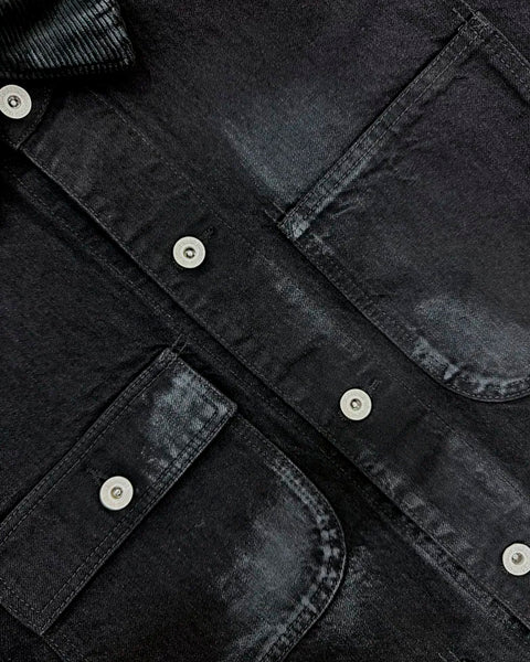 A work coverall jacket made from 12oz denim fabric with a corduroy collar. Treated with distress processing for a natural aged look. Features original tack buttons. Part of the "BLACK & WHITE" series, designed with a uniform concept, and includes a dedicated name tag. The brand tags are specially finished in the same color as the body.